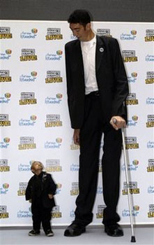 (世界一背の高い男性と世界一背の低い男性。世界一背の高い女性モデル、アマゾンイブさん)